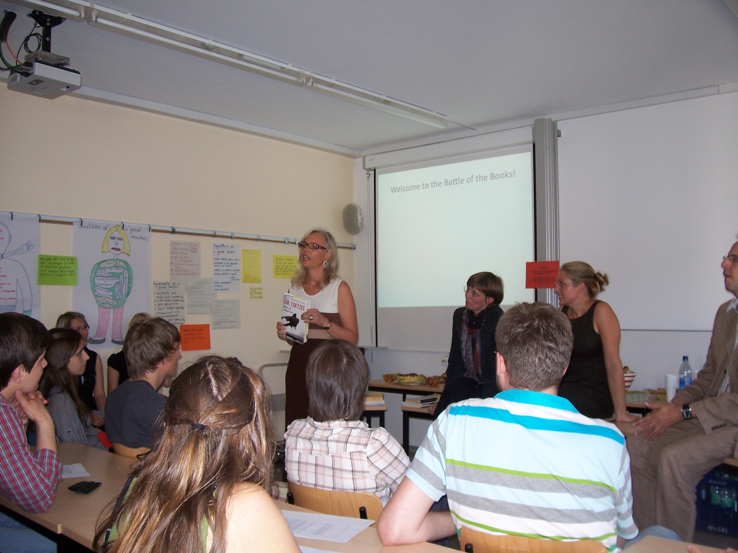 - The Battle of the Books (with Professor Ingo Berensmeyer, Dr. habil. Ute Berns and Dr. Andrea Rummel) (Poster) This literary soirée consisted of a debate between Ingo Bernsmeyer, Ute Berns, and Greta Olson and was moderated by Andrea Rummel. We argued about the relative merits of Kazuo Ishiguro’s Never Let Me Go (2005), Dara Horn’s The World to Come, and J.M. Coetzee’s Diary of a Bad Year (2007) and read passages from these novels aloud. After the ‘battle’ audience members added their comments, and the evening was concluded with wine and food.