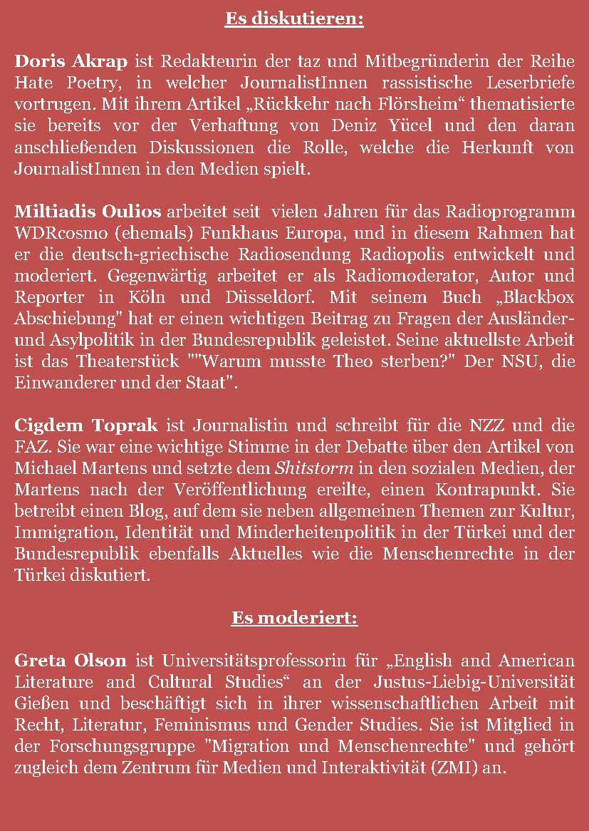 - Podium discussion “Herkunft als Falle. Journalismus und Migration im 21. Jahrundert” (June 6, 2017)
