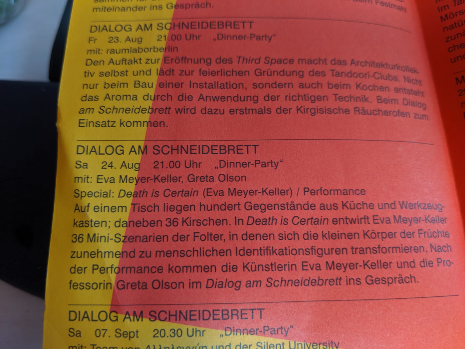 - Dialog with Eva Meyer-Keller on the performance “Death Is Certain” as part of the “Dialog am Schneidebrett / Dinner Party” (23 August 2019) at the Ruhrtriennale, Bochum
