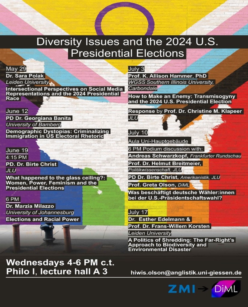 - Podium Discussion: As part of the ZMI’s (Zentrum für Medien und Interaktivität, University of Giessen) „Digitaler Habitus“ week, Greta Olson took part in a podium discussion, „Voices from Abroad: Americans in Germany Discuss the 2020 U.S. Elections“ (November 3, 2020, at 6 pm).The event addressed what it is like to be an American living in Hesse amidst such a momentous election season. Six different American ex-pats in Germany sat down on election night to talk about the divisive presidential, congressional, and gubernatorial 2020 elections and their consequences. The podium discussion was held in english and took place online.