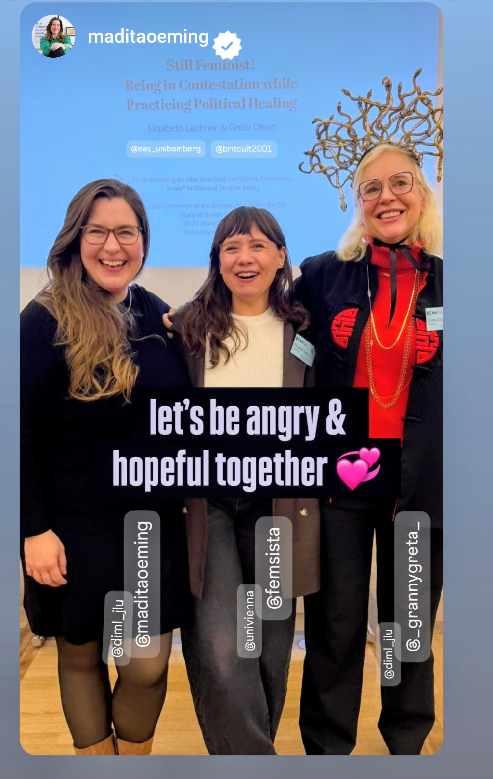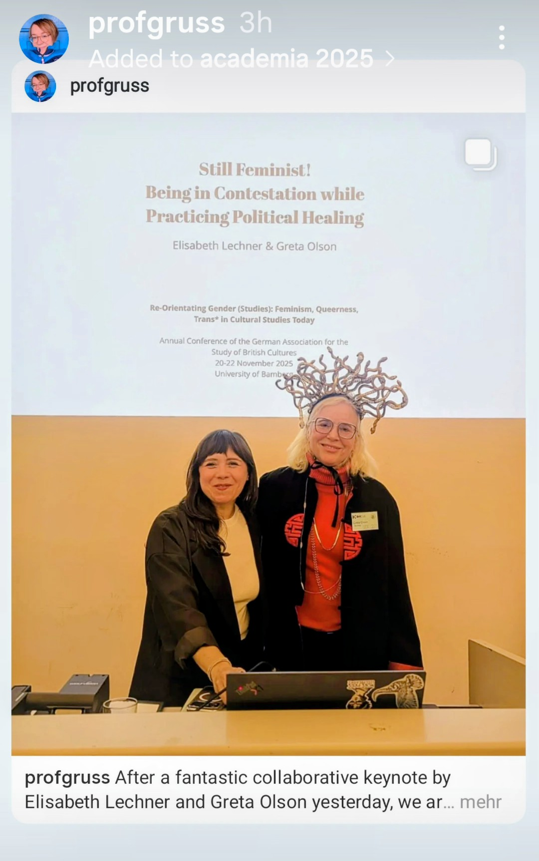 - Keynote in Dialogue with Elisabeth Lechner: “Still Feminist! Being in Contestation while Practicing Political Healing” at the 2025 German Association for the Study of British Cultures Conference “Re-Orientating Gender (Studies): Feminism, Queerness, Trans* in Cultural Studies Today” (20 November 2025) University of Bamberg.