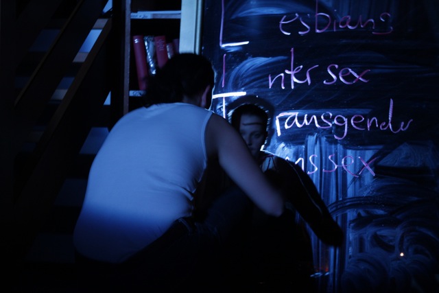 Performance of B_Oops, we did it again: The Ultimate Activist Gender Experience by Christoph Bovermann and Kathrin Ebmeir. Pictures: Arch, Betty Page Spank, Curtain, Ententanz, Fabglitter, Lecture, Monsters Bedroom, Moon, Naked, Spotpose, Suspenders, created in the context of Doing and Undoing Gender
